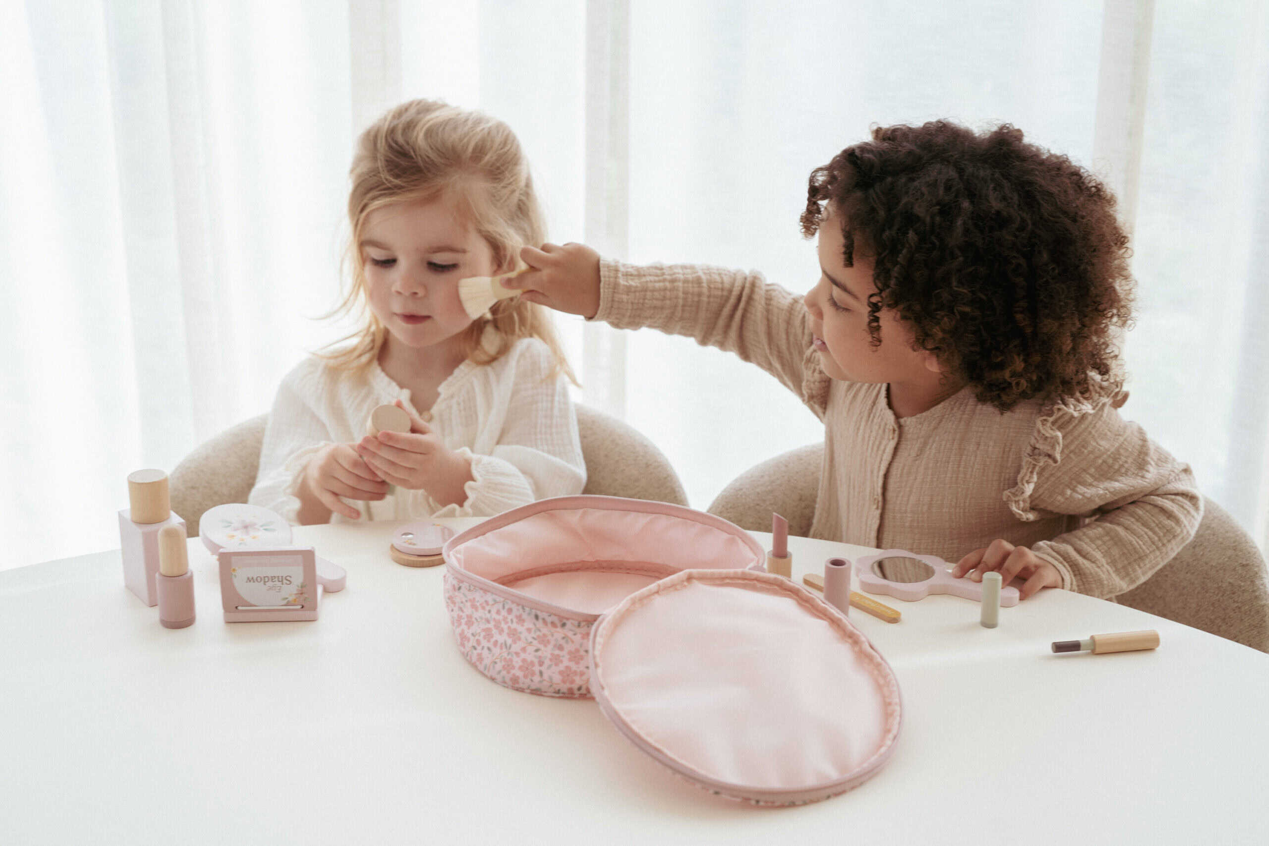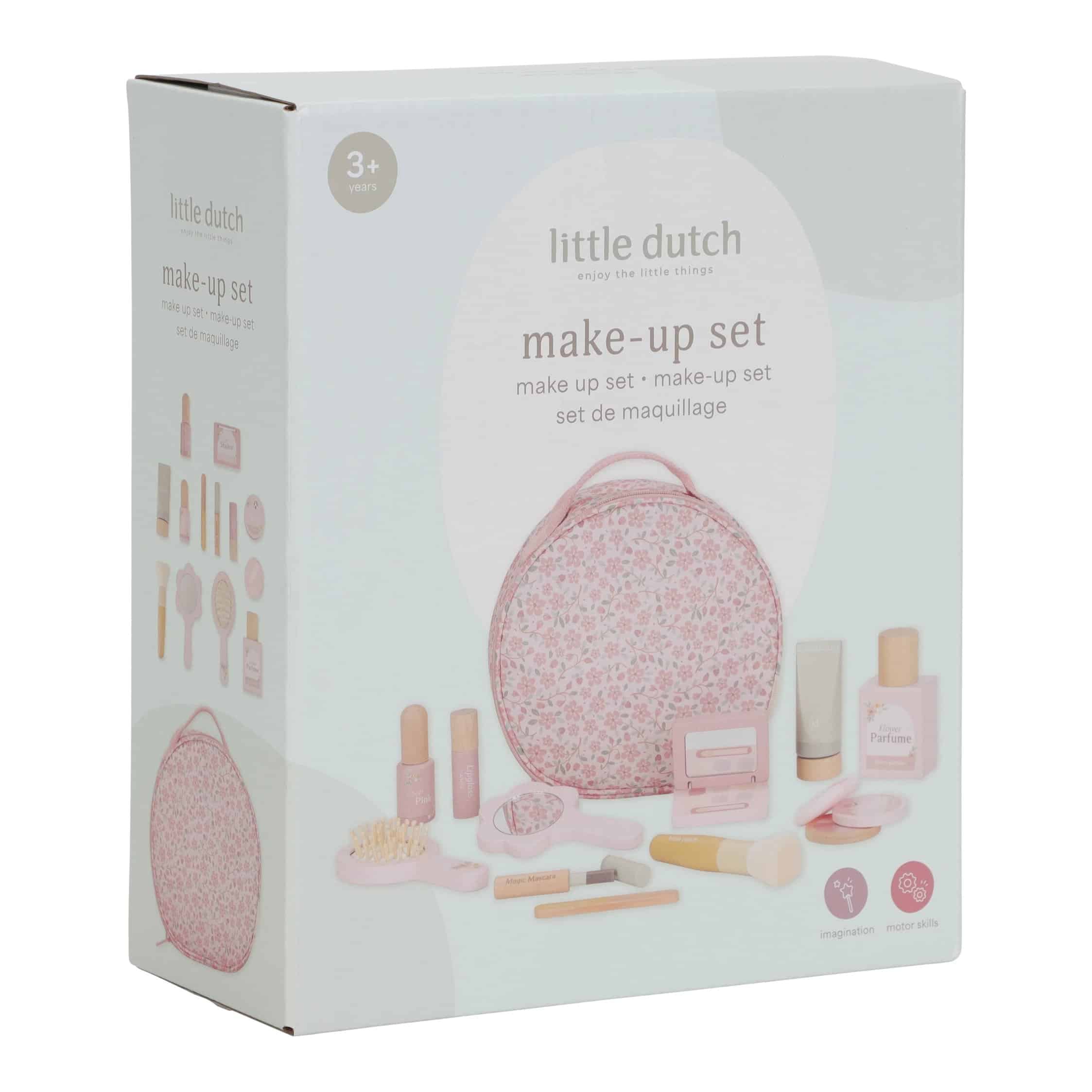 Com este lindo conjunto de maquilhagem em madeira, a sua pequena pode divertir-se sem parar!A bolsa floral macia está repleta dos mais maravilhosos produtos de beleza, como um espelho de mão, frasco de perfume, batom, verniz e muito mais.O conjunto é perfeito para brincadeiras de faz de conta e brincadeiras imaginativas –sem sujidade!