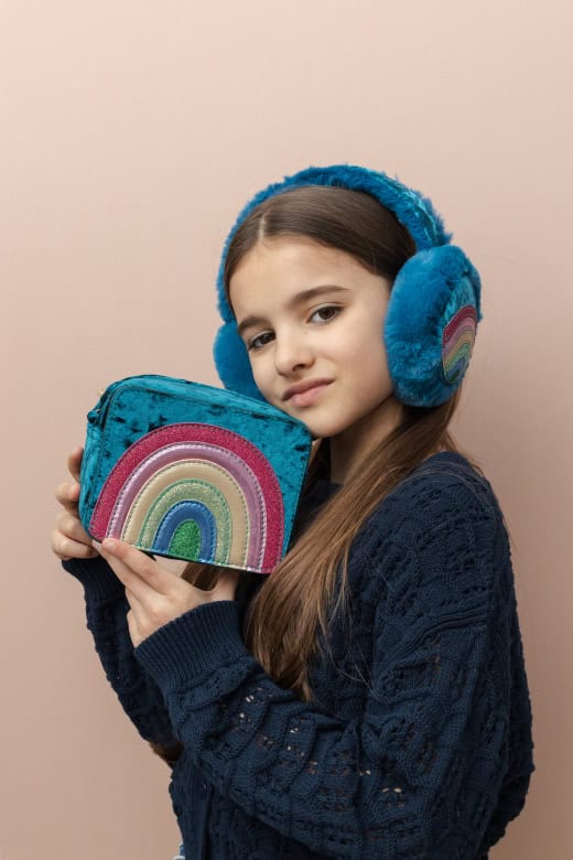 Ilumine o dia deles com a nossa bolsa arco-íris Radiant!Confeccionada em veludo azul-petróleo macio, esta linda bolsa é perfeita para adicionar um toque de cor animador a qualquer look! Apresentando um arco-íris de cores vibrantes, confeccionado com uma linda mistura de glitter e tecidos metálicos. Fecho de zíper. Medidas aproximadas: L 15 cm x P 7 cm x A 11,5 cm. Comprimento da alça: aproximadamente 48 cm