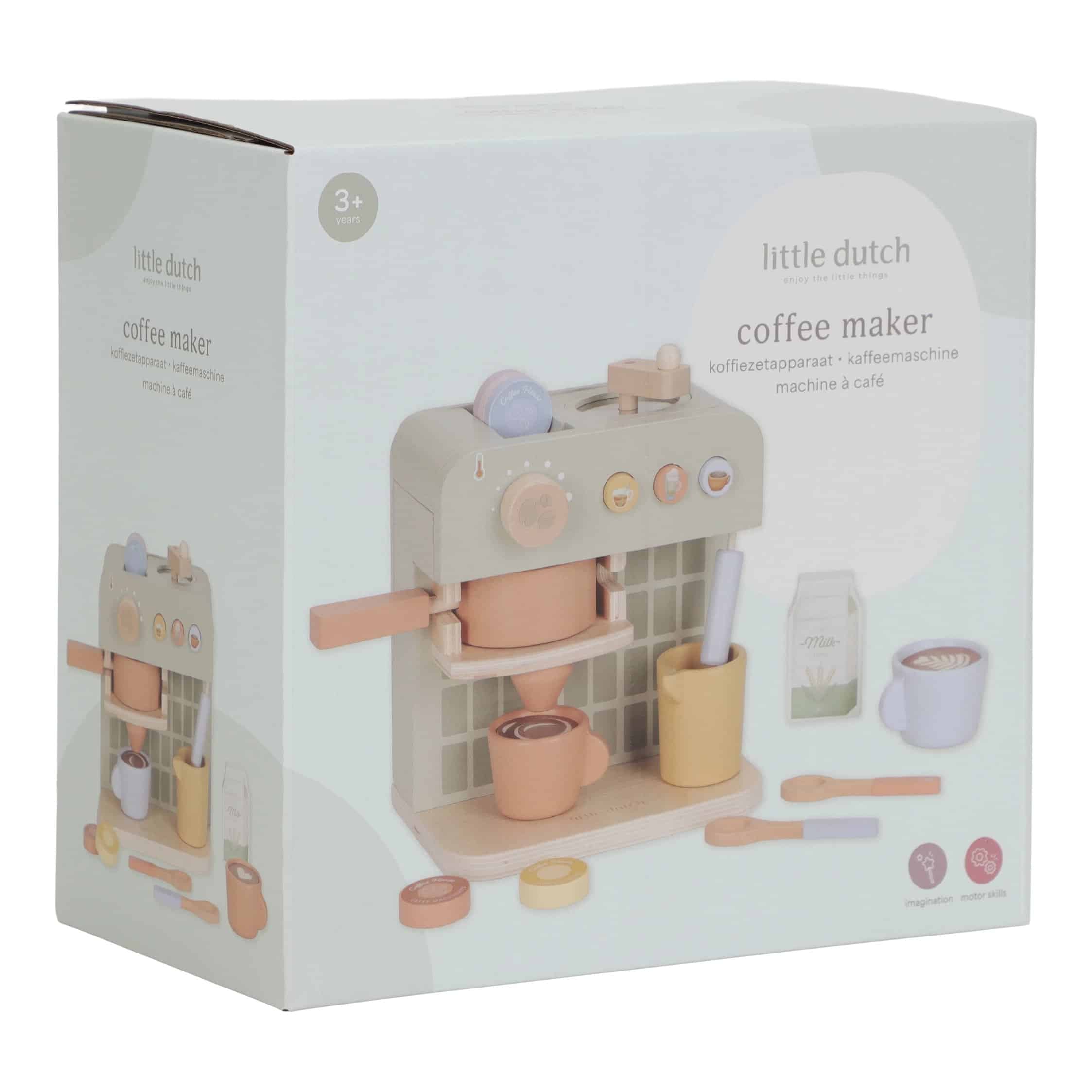 Hora de uma deliciosa chávena de café ou chá! Com esta máquina de café de madeira, os pequenos baristas podem moer grãos, inserir cápsulas de café e mexer a bebida com uma colher.