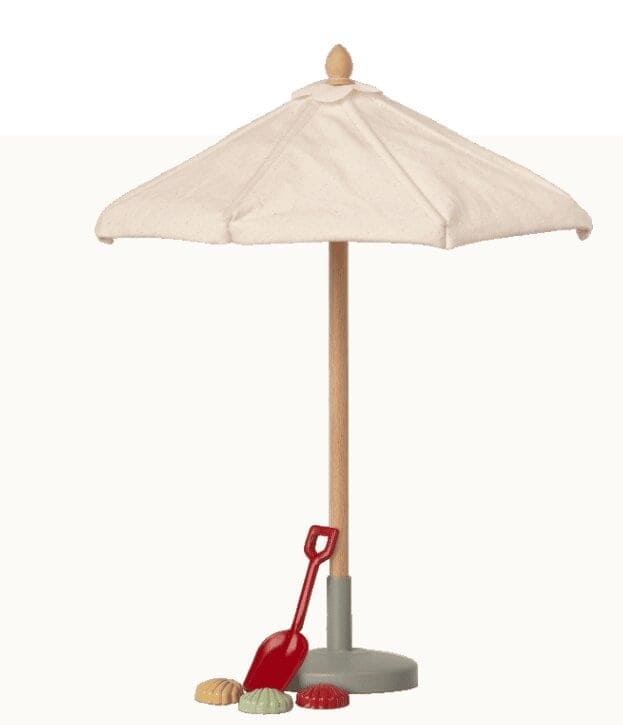Lindo guarda-sol Maileg em algodão natural com uma haste de madeira e um pé de metal em verde-poeira.