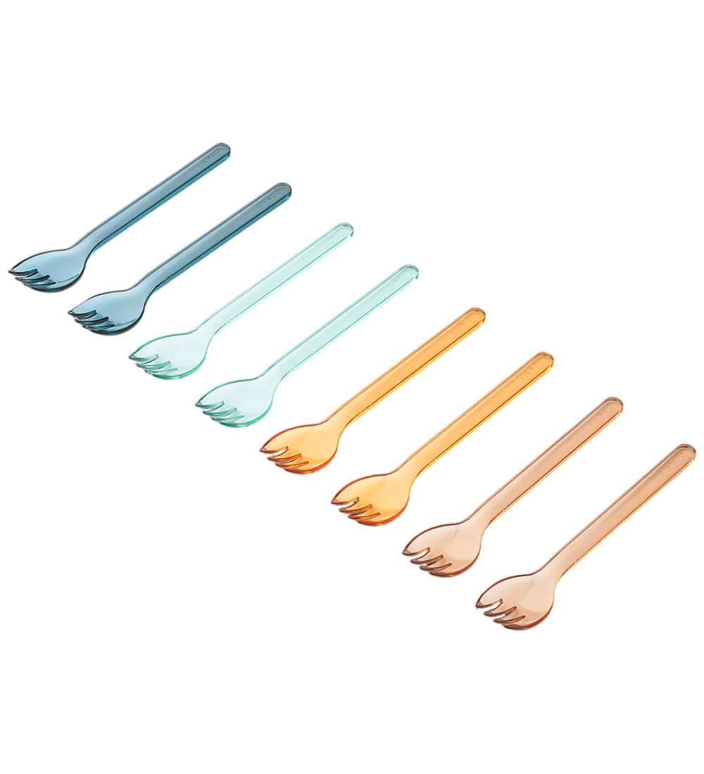 Conjunto de 8 garfos Liewood em diferentes cores transparentes.