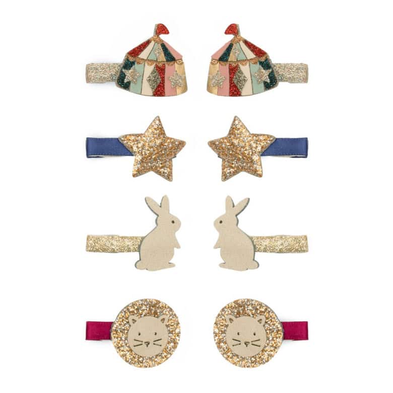 Leões, tendas de circo, coelhos e estrelas feitos com uma mistura de glitter, tecidos metálicos e camurça macia.