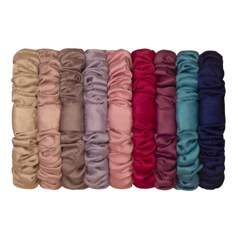 Oito mini scrunchies macios e sedosos num arco-íris de cores!