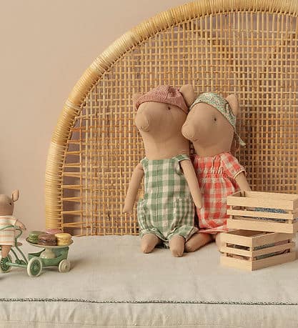 O porquinho Maileg pode ser usado como uma boneca, e as roupas podem ser tiradas e vestidas. O corpo é preenchido com pellets de PP, o que lhe confere mais peso.