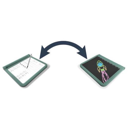 O seu filho pode reproduzir fielmente letras, números ou um desenho existente. O verso funciona como uma prancheta preta com efeito neon que realça as cores do desenho à noite. Com tampa magnética e pés de borracha, não há risco de movimentação da folha de desenho copiada.