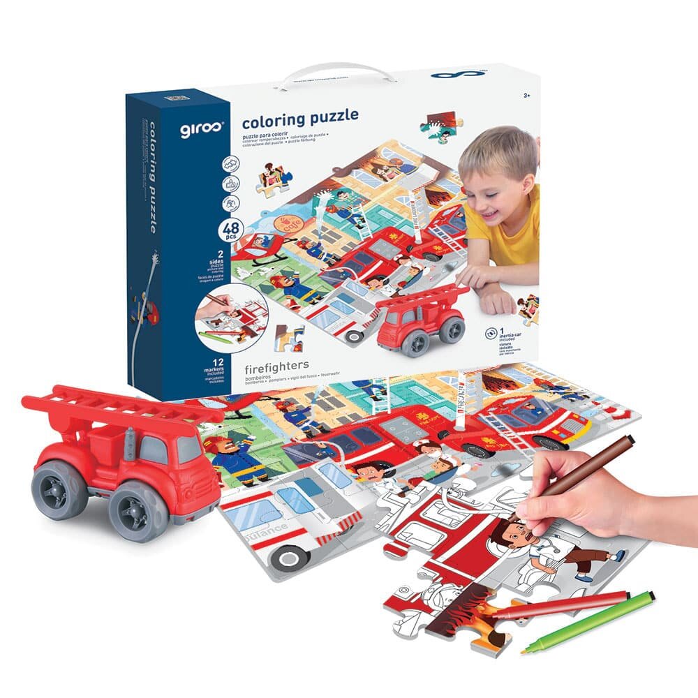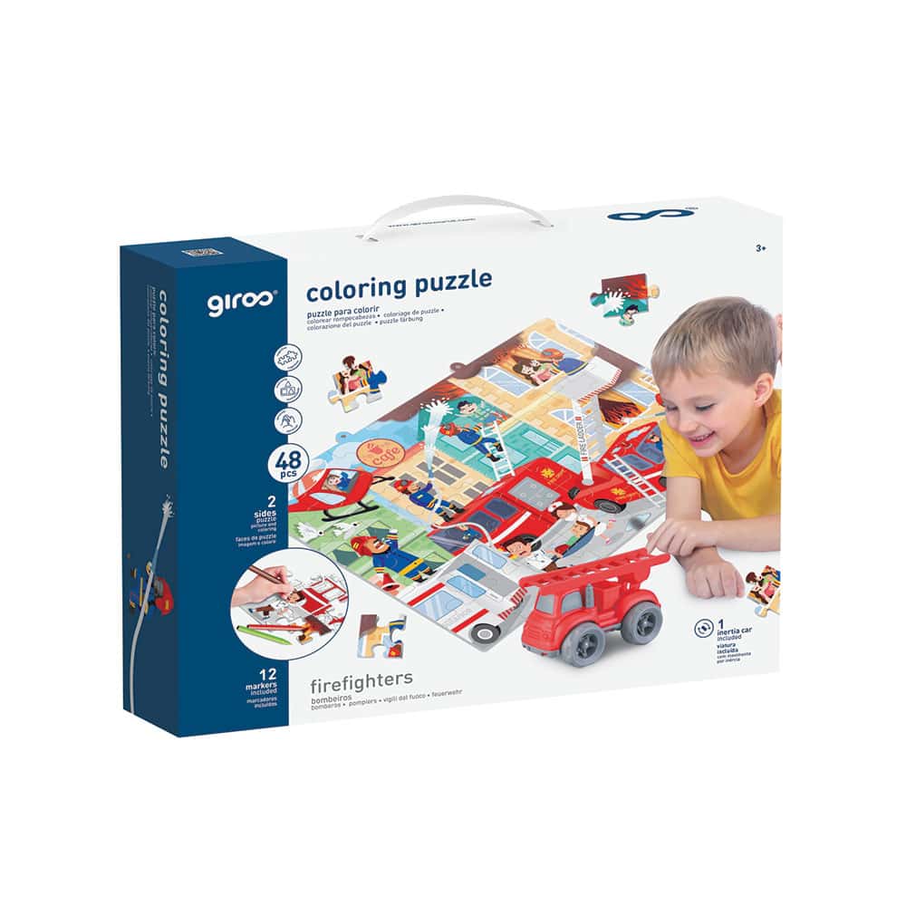 Este puzzle duplo permite à criança montar um puzzle normal de 48 peças e verificar que no verso existe um puzzle para colorir. Inclui 12 marcadores para colorir. Inclui ainda um veículo temático que permite à criança brincar no circuito definido pelo próprio puzzle.