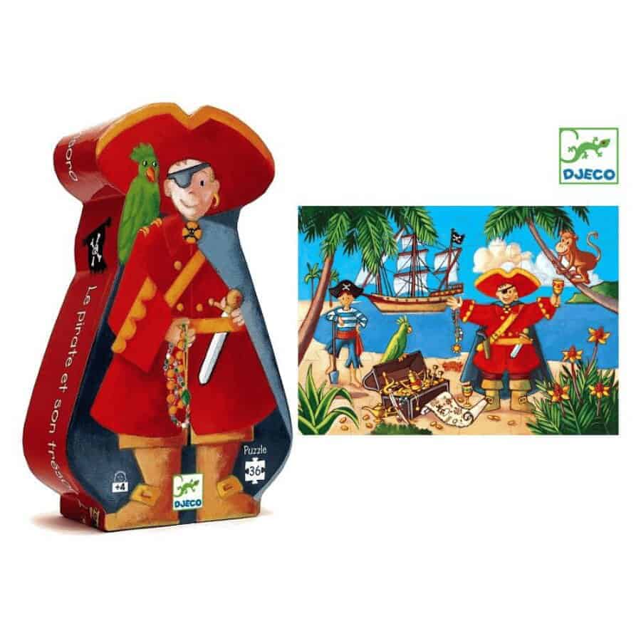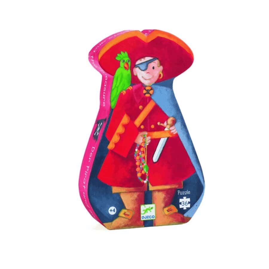 Um puzzle muito divertido, com o tema dos piratas. Como a caixa é em forma de silhueta, este puzzle também serve como elemento decorativo no quarto dos/as mais pequenos/as. Feito em França36 peçasTamanho do puzzle: 42×30 cmIdade: 4 – 8 anos