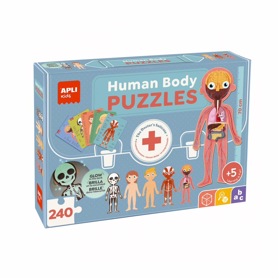 Inclui 5 quebra-cabeças em formato de corpo humano e 15 cartas com informações detalhadas em 12 idiomas diferentes. Os puzzles são jogos ideais para crianças, pois, enquanto se divertem, ajudam-nas a aprimorar e desenvolver diversas habilidades: concentração, observação, memória e resolução de problemas; além de desenvolver a percepção espacial, a coordenação motora fina, o reconhecimento de formas, a coordenação motora e as habilidades matemáticas.