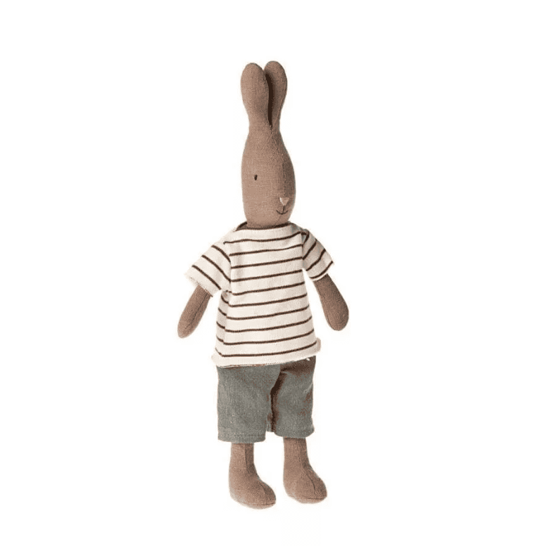 Este adorável coelho, tem o corpo castanho claro, detalhes bordados à mão e veste uma blusa e shorts listrados.