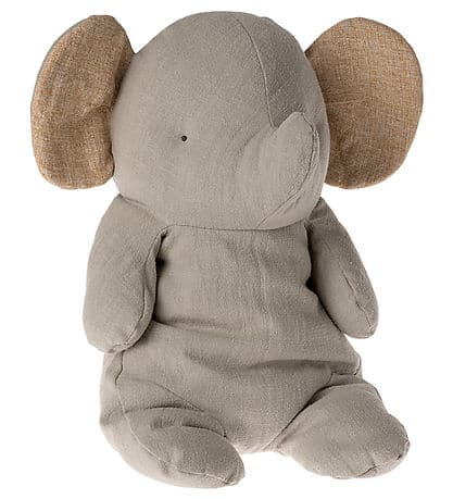 Um lindo brinquedo Maileg em formato de elefante, na cor cinza. As orelhas são bege por dentro com quadrados amarelos. O brinquedo macio Maileg é macio e fácil de abraçar, e ele consegue sentar sozinho, pois é preenchido com pelotas de PE nas pernas.