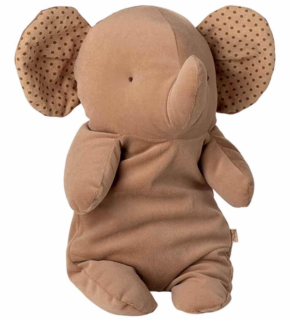 Lindo brinquedo macio Maileg em formato de elefante, na cor rosa escuro e empoeirado, com orelhas pontilhadas. O brinquedo de pelúcia Maileg consegue sentar-se sozinho, pois possui bolinhas de PE nas pernas, além de ser macio e fácil de abraçar. O brinquedo de pelúcia tem uma superfície de veludo macio.