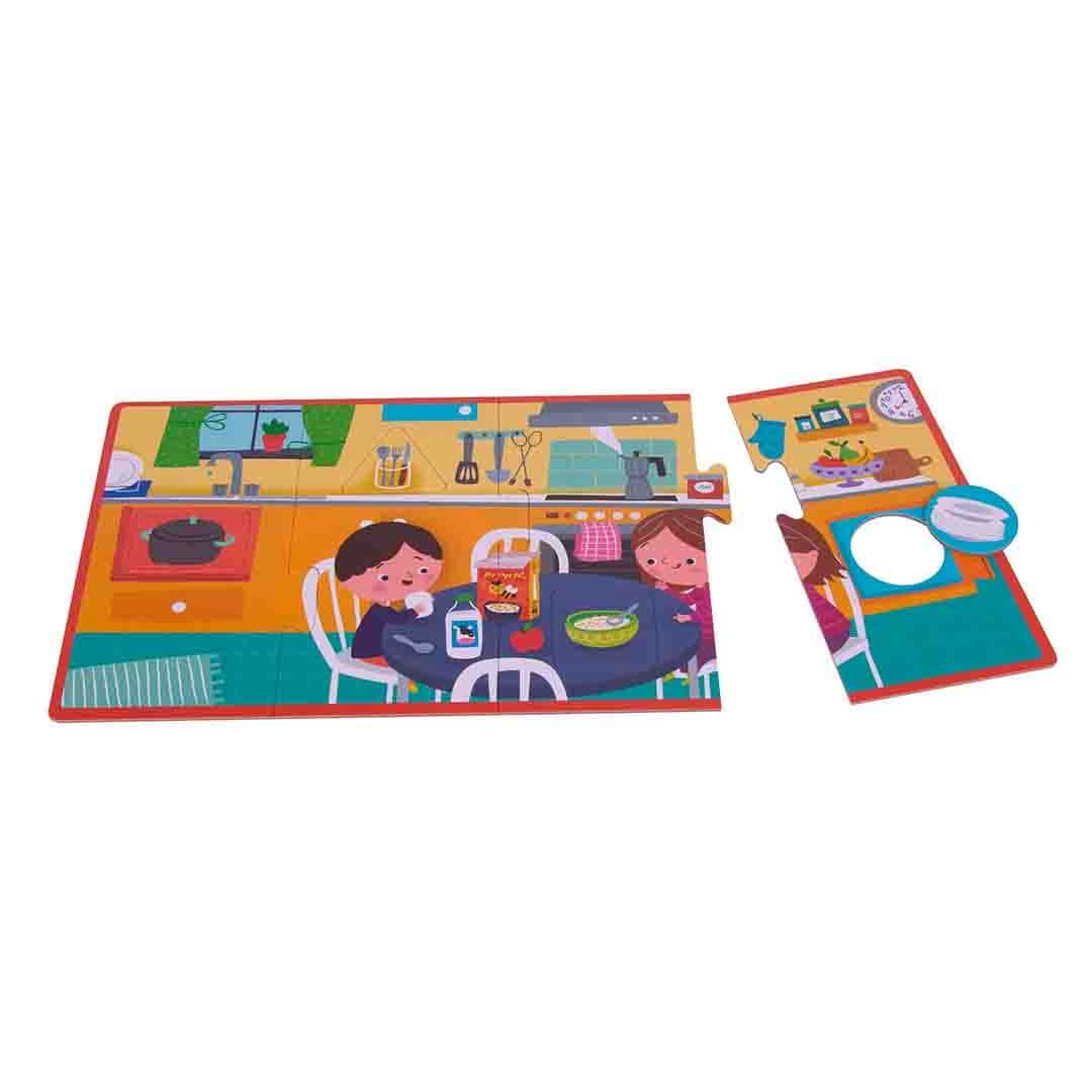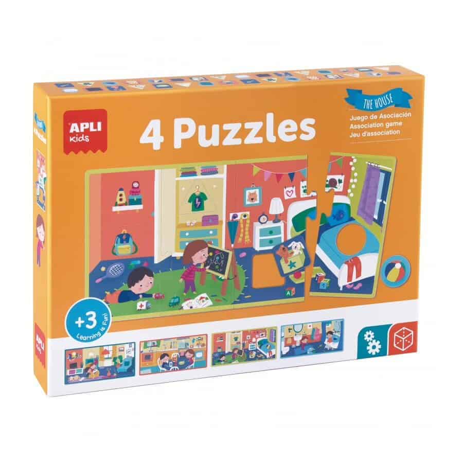 Set de 4 puzzles de 4 peças XL. As crianças têm que montar o puzzle e reconhecer e identificaro o seu elemento no seu ambiente (o quarto, a casa de banho, a cozinha e a sala de estar).