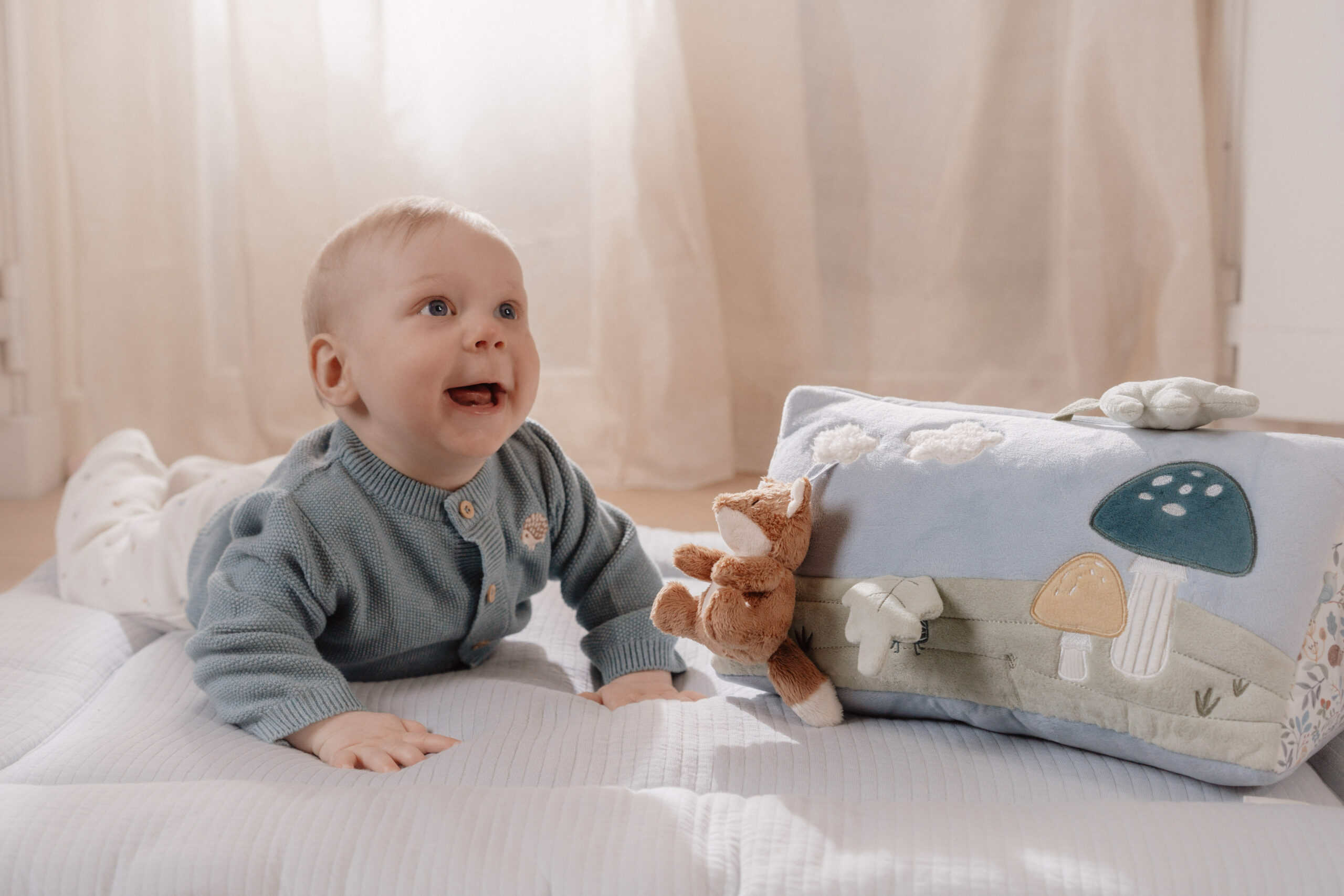 Embarque numa aventura com os Amigos da Floresta enquanto está de bruços! Este triângulo de atividades versátil leva o seu pequeno a uma aventura por uma floresta encantadora. Há muito para descobrir ao longo do caminho, desde uma folha que faz barulho de papel amassado até um pequeno espelho.