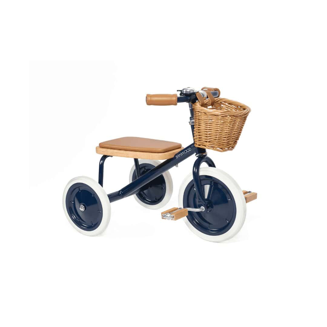 Triciclo Banwood clássico: seguro, confortável e elegante. Melhore o desenvolvimento do seu filho com pedais de madeira, couro vegano e cesta de vime.