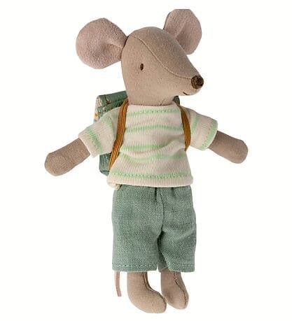 O irmão mais velho, o rato, está vestido para um dia na escola, carregando sua mochila nas costas. Ele tem ímãs nas mãos para poder segurar as alças do triciclo para uma viagem rápida.