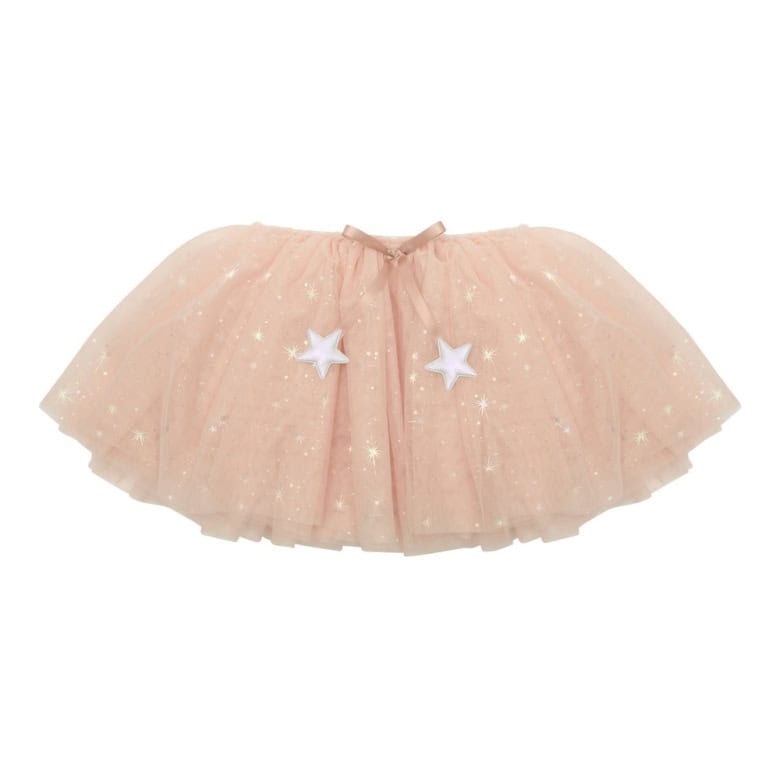 Camadas de tule rosa suave salpicadas de estrelas metálicas. Cós elástico (aprox. 52 cm) com laço de fita de cetim com pingentes de estrelas acolchoadas prateadas. Mede aproximadamente 28 cm de comprimento.