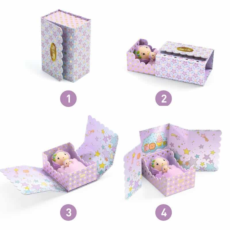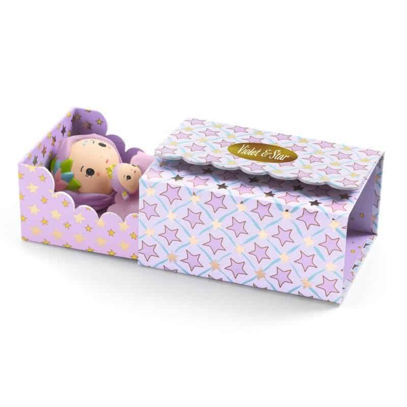 Agora a colecção Tinyly ficou ainda mais fascinante. A caixinha transforma-se no quarto de Violet, onde as figuras se podem aconchegar debaixo das cobertas. O quarto de Violet e o seu inseparável companheiro Star são um adorável espaço em miniatura. Este mundo cheio de doçura e encanto poético oferece um design de quarto de boneca e complementa as casinhas portáteis Tinyly.