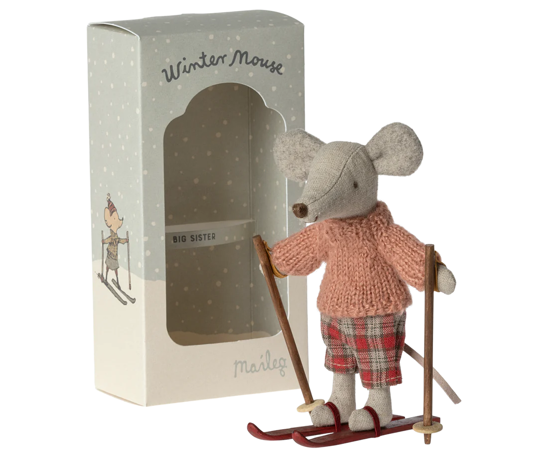 A adorável irmã mais velha Maileg está vestida para o inverno com uma blusa de tricô rosa, calças xadrez vermelhas e um conjunto de esqui e bastões de esqui.