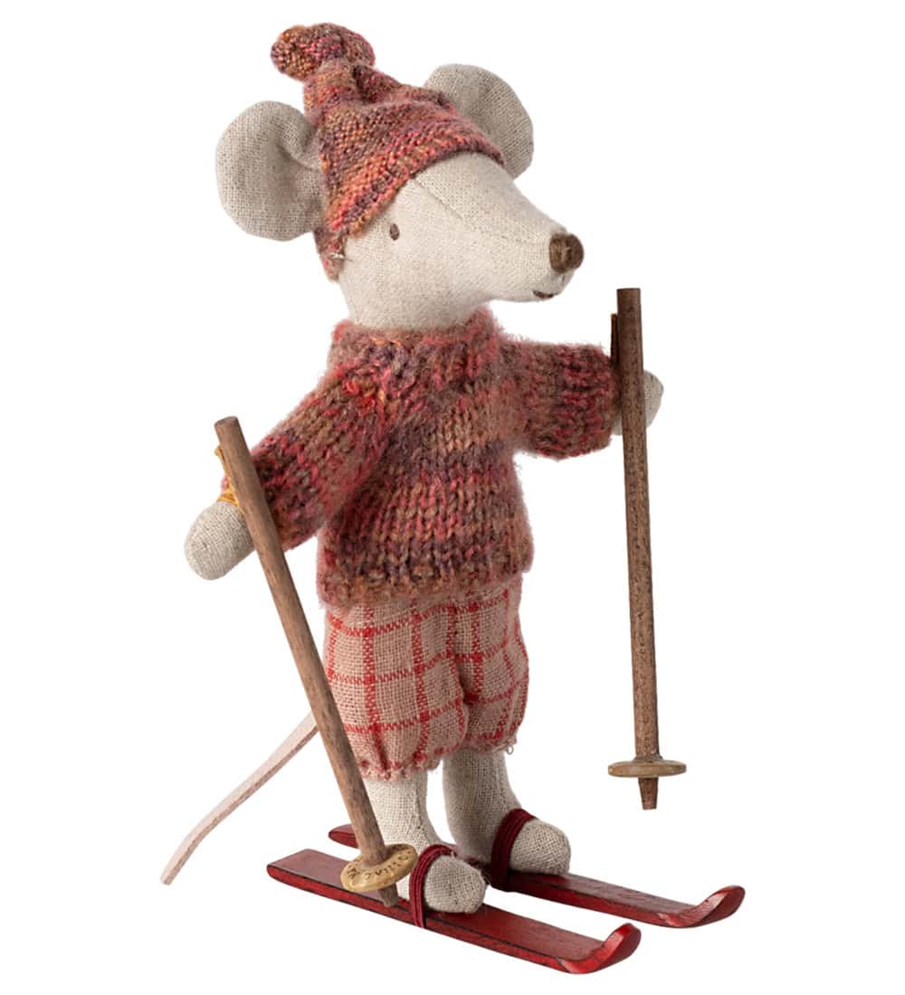 Boneca Maileg fofa com blusa de tricô rosa e roxo, além de calças xadrez rosa. Vem equipada com esqui, perfeita para brincar e contar histórias.