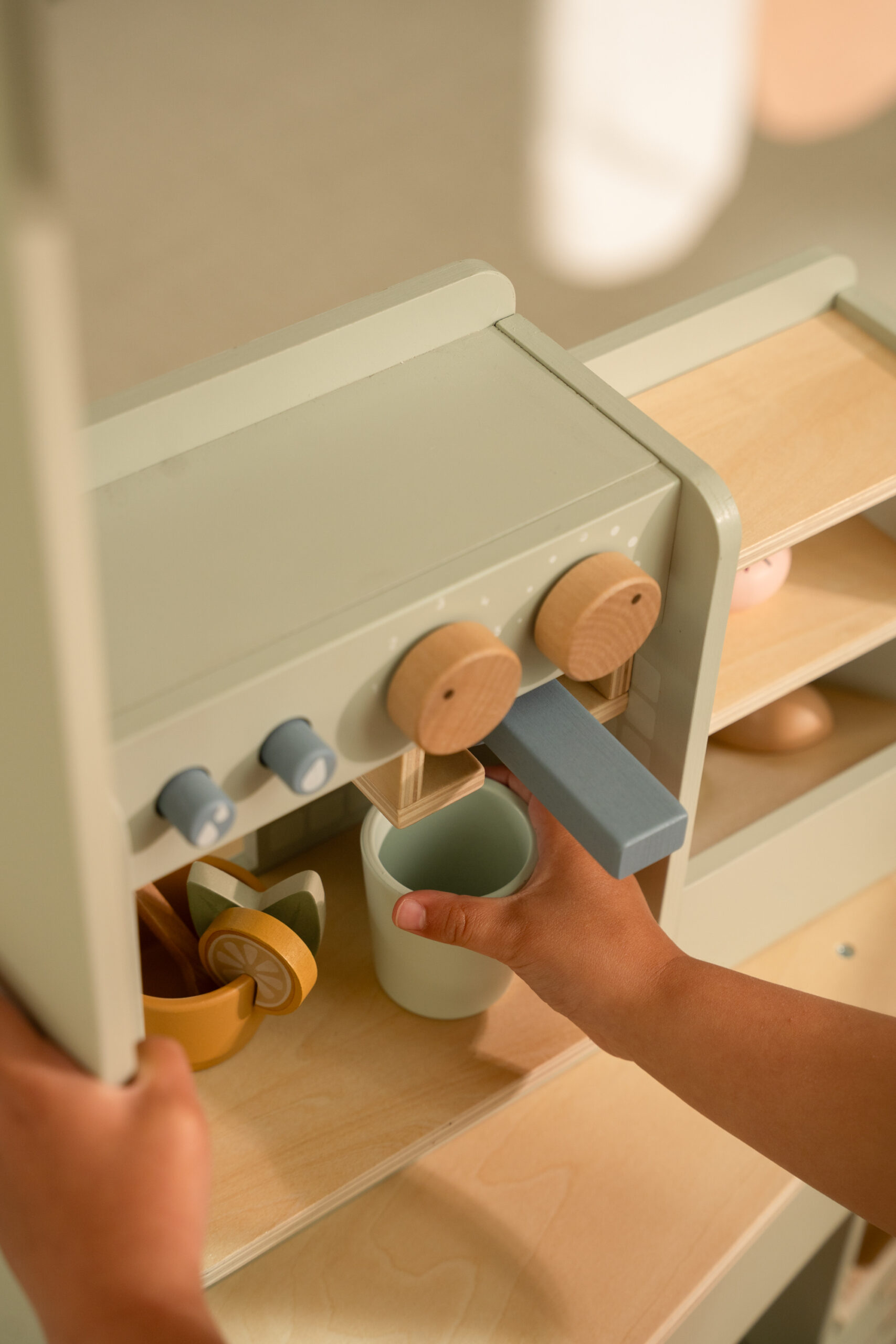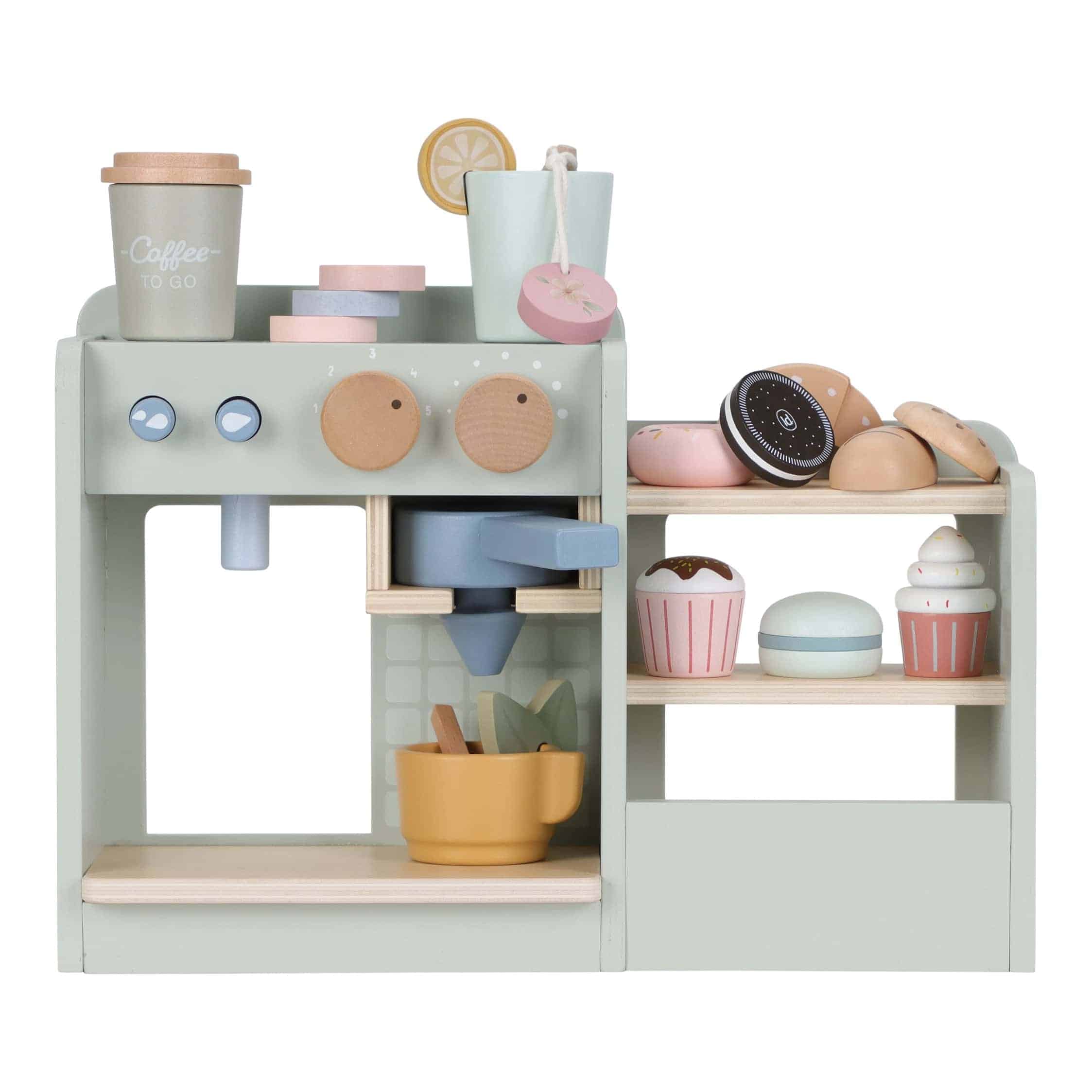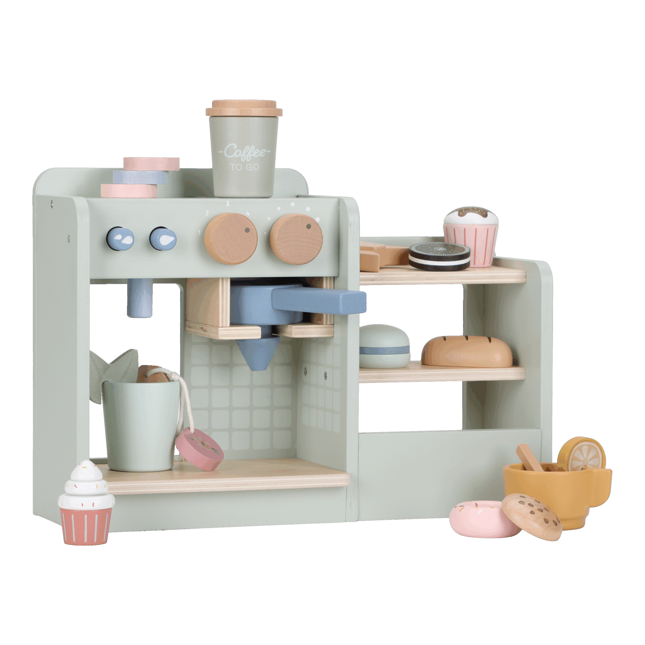 Bem-vindo ao cantinho do café mais acolhedor! Sirva uma deliciosa chávena de café ou chá com uma sanduíche ou doce fresco. Com este lindo cantinho do café de brinquedo, o seu pequeno pode carregar em botões, escolher a configuração certo e colocar uma almofada de café para uma verdadeira experiência de barista.